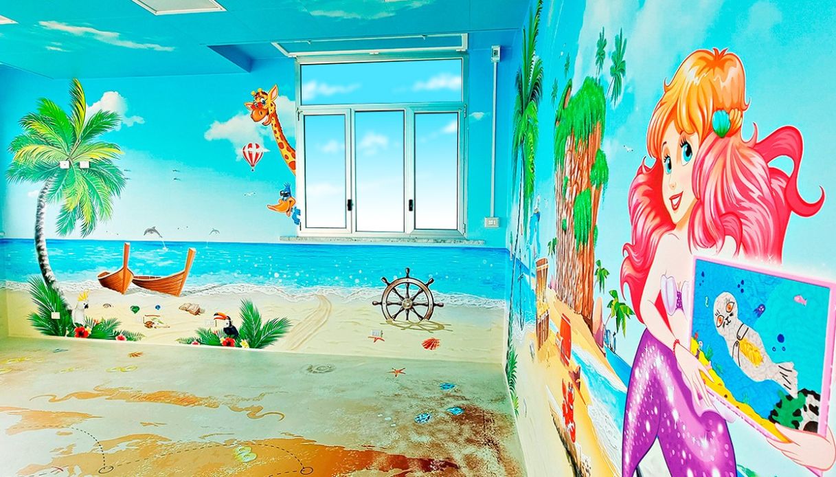 A realizzarla è stato Silvio Irilli, artista italiano e fondatore di Ospedali Dipinti, che ha trasformato la sala giochi del reparto in un mondo inedito e straordinario, un universo fantastico dove i bambini possono perdersi, immergersi e continuare a sognare.