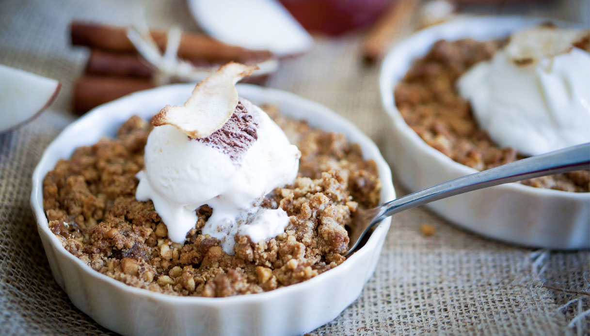 Ingredienti per 6 persone: 6 mele, 200 g di zucchero, 1 puntina di chiodi di garofano, mezzo cucchiaino di cannella, 2 cucchiaini di succo di limone, 90 g di farina setacciata, 1 pizzico di sale, 85 g di burro, 30 g di noci tritate, palline di gelato.