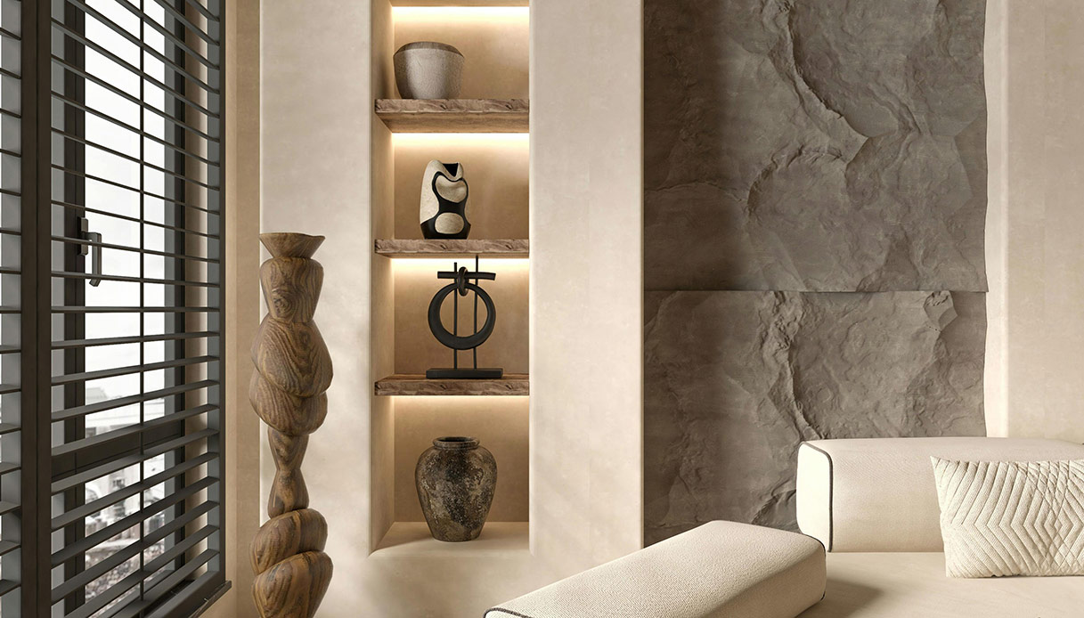 La valorizzazione della matericità si può ottenere anche tramite lavorazioni che esaltino la struttura naturale della pietra: le superfici non sono più un semplice rivestimento ma si trasformano in un vero e proprio decoro.