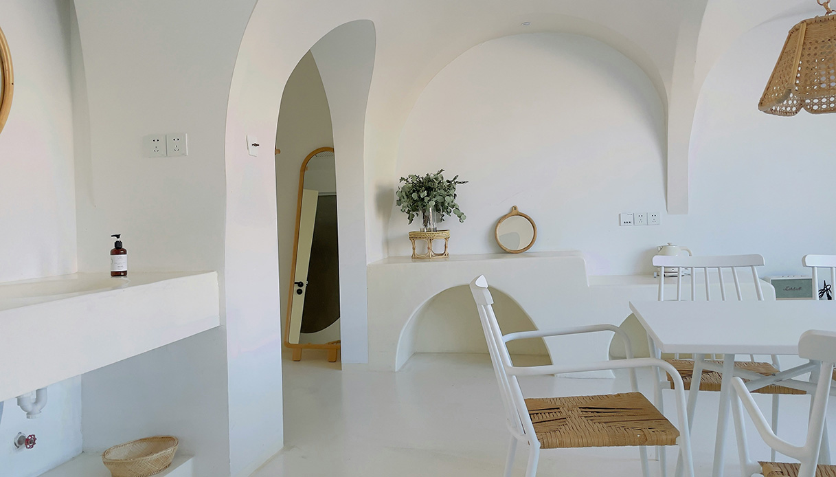 I colori sono il respiro vitale di ogni ambiente, capaci di trasformare uno spazio e di influenzarne profondamente l’atmosfera. Il bianco puro delle pareti, fresco e luminoso, riflette con dolcezza la luce naturale che filtra dalle finestre, amplificando la sensazione di apertura, spazio e serenità. Accenti delicati di sabbia, azzurro tenue come le acque calme di una baia mediterranea e verde salvia, che richiama le foglie degli ulivi mossi dalla brezza, si intrecciano armoniosamente per riportare alla mente orizzonti marini infiniti e cieli estivi limpidi e tranquilli. Questa palette morbida e raffinata avvolge la casa in una quiete rarefatta, creando un’atmosfera sospesa e intima, un vero e proprio invito a rallentare i ritmi frenetici della vita urbana e a godere appieno di ogni prezioso attimo.