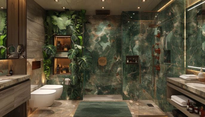 Il luogo ideale per sperimentare il marmo verde è senza dubbio il bagno. Immagina una parete rivestita in questa pietra preziosa, accompagnata da dettagli in ottone e finiture bianche: un invito a immergersi in un’oasi di relax, lontano da scelte ordinarie. Un bagno in marmo verde non è un semplice spazio, ma una dichiarazione di personalità e stile.