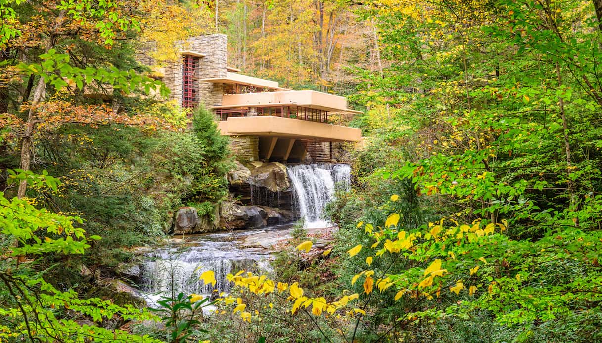 La Casa sulla cascata è il nome italiano con cui è conosciuta Fallingwater, o Casa Kaufmann: si tratta di una villa meravigliosa, realizzata sul ruscello Bear Run, proprio nel punto in cui il corso d’acqua si tuffa tra le rocce trasformandosi in una spettacolare cascata. Siamo negli Stati Uniti, e più precisamente in una piccola cittadina nell’area suburbana di Pittsburgh, in Pennsylvania. La casa venne costruita nel bel mezzo di un rigoglioso bosco, fondendosi perfettamente con la natura circostante e integrando persino la cascata. Viene per questo motivo considerata uno degli esempi perfetti di architettura organica, che punta all’armonia tra l’uomo e l’ambiente naturale, come parte di un unico organismo interconnesso.
