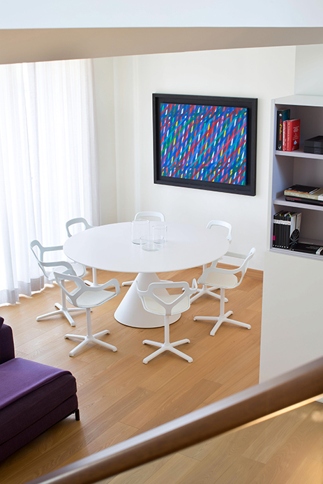Con le sue forme geometriche e il rivestimento colorato, la poltrona si impone come elemento scultoreo, creando un dialogo armonico con il divano, tra contrasti di linee rette e curve. Nella zona pranzo adiacente, un tavolo “Clay” di Desalto, dal caratteristico basamento scultoreo a forma di clessidra, è circondato dalle iconiche sedie modello “Trace” di Desalto, che con la loro leggerezza visiva non appesantiscono l’ambiente.