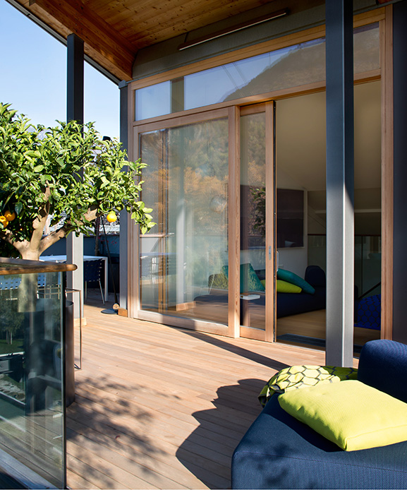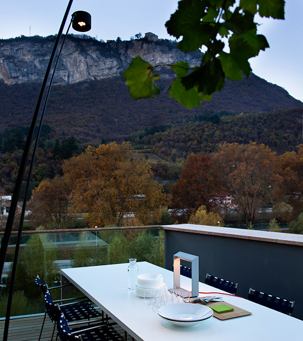 Salendo, si raggiunge la terrazza sul tetto: il vero gioiello della casa. Qui, una zona pranzo e un living outdoor ospitano cene estive e momenti di convivialità, con una vista che abbraccia il parco urbano e le montagne trentine, accese dalle luci del tramonto.
