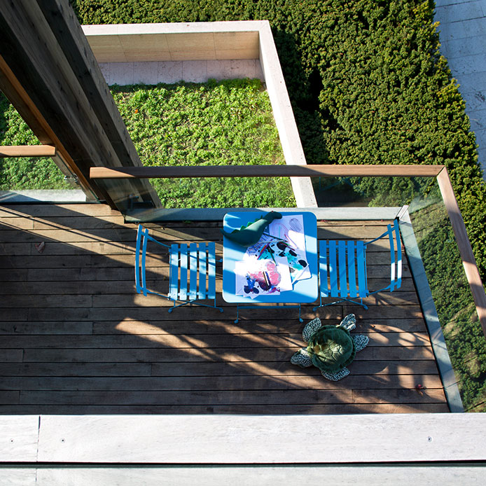 Al livello inferiore, un terrazzino adiacente alla cucina accoglie il rito del caffè del mattino, immersi nel verde. Poco più in là, una terrazza più ampia – collegata alla zona notte delle bambine – diventa uno spazio sicuro per il gioco e la creatività all’aria aperta.