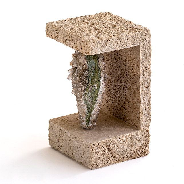 Un esempio emblematico della capacità di Budri di reinventare il marmo è il side table Geodie White Quartz, della collezione Geodies disegnata da Patricia Urquiola. Questo tavolino one of a kind in travertino si presenta con una forma rigorosa a “T” che racchiude al suo interno un vero tesoro naturale: un grande geode di quarzo bianco dalle sfumature lattiginose.