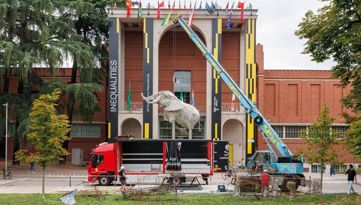 La serie La fragilità del futuro è “composta da quattro animali a rischio di estinzione: le opere sono una riflessione sulla fragilità della nostra realtà ecologica e sulle disuguaglianze che segnano la nostra relazione con il mondo naturale”, come spiegato dalla Triennale. L’elefante prende così purtroppo il posto della balenottera, sempre realizzata in cartapesta, che è stata incendiata il 14 luglio.