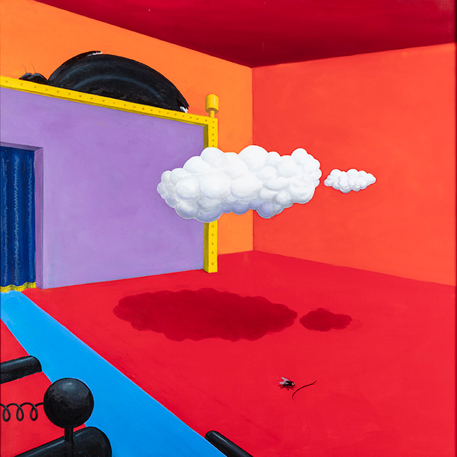 Il titolo enigmatico della mostra è una promessa di meraviglie: tre simboli che guidano i passi del visitatore tra opere oniriche e stravaganti. Si viene accolti da visioni sorprendenti: un grande uovo misterioso che sembra custodire segreti inespressi, figure evanescenti di scheletri che danzano tra ironia e bellezza, colori vivi come in un arcobaleno che irrompe sulla tela portando con sé il sorriso della fantasia.
