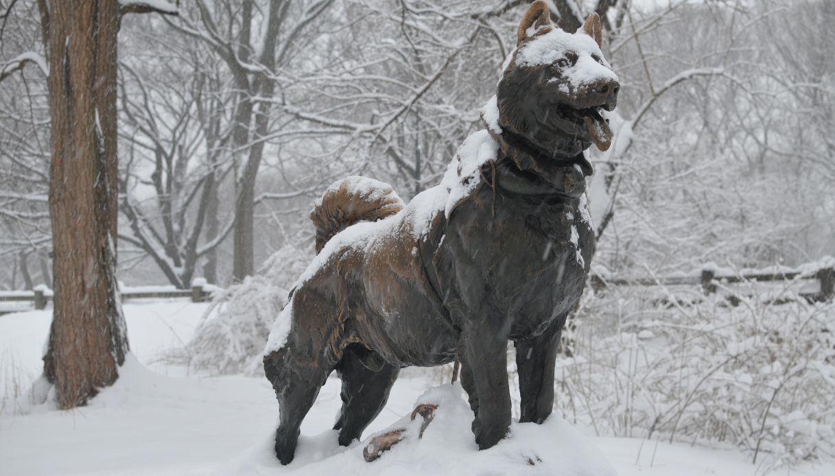 “Dedicata all’indomabile spirito dei cani da slitta che trasportarono, per seicento miglia sul ghiaccio accidentato, attraverso acque pericolose e tormente artiche l’antitossina da Nenana in soccorso dei malati di Nome nell’inverno del 1925”.