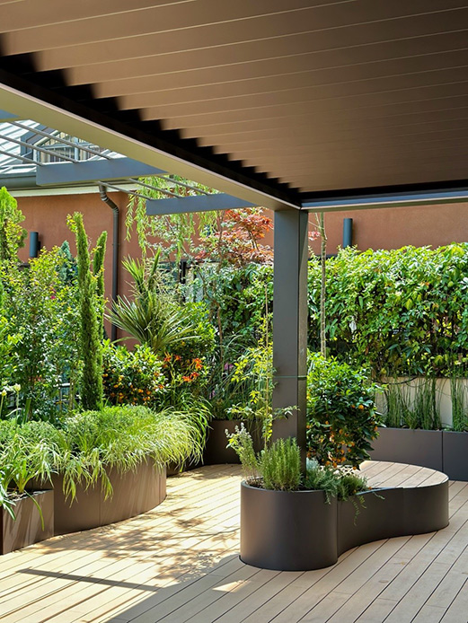 Emanuele Lai: Sì, perché il terrazzo è un micro-ecosistema sospeso. Oltre all’estetica, bisogna considerare il peso delle fioriere, l’esposizione al vento e al sole, l’irrigazione costante. Per questo studiamo soluzioni su misura: l’alluminio, ad esempio, è un materiale leggero e inossidabile, ideale per fioriere resistenti e durature. Quando il budget è più limitato, possiamo optare anche per resine rotazionali o polimeri di alta qualità, comunque molto validi.