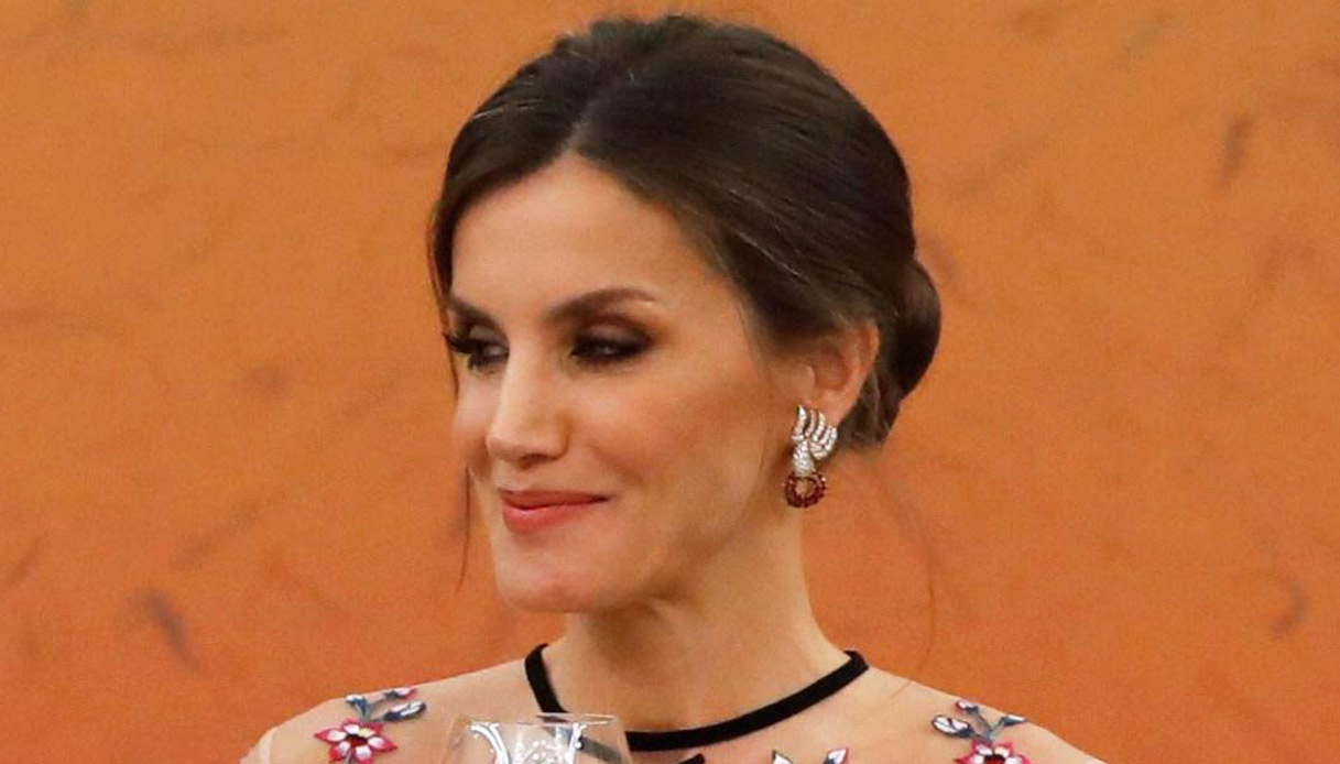 La Regina lo abbina a delle scarpe in plexiglass del marchio cult, Manolo Blahnik. Orecchini e bracciale, tempestati di rubini, appartengono a Donna Sofia. Letizia porta i capelli raccolti in un morbido messy bun, tanto amato da Meghan Markle, e un sapiente make up che esalta lo sguardo ma dà alle labbra un effetto nude.