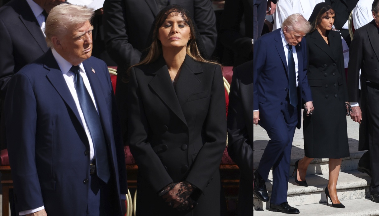 Melania Trump, pur seguendo formalmente il dress code richiesto per i funerali di Papa Francesco, ha optato per scelte stilistiche che non sono passate inosservate. La first lady ha indossato un coat-dress doppiopetto nero sotto al ginocchio, abbinato a un velo leggero posato sul capo e a un paio di guanti in pizzo nero. Un crocifisso discreto al collo completava il suo ensemble.