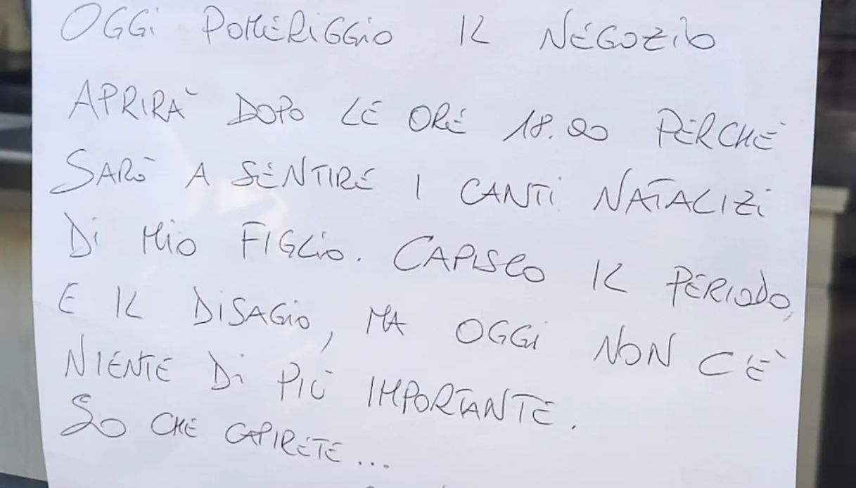 Nel pieno della stagione dei regali, periodo cruciale per qualsiasi commerciante, Davide ha fatto una scelta coraggiosa. Ha deciso di chiudere il suo negozio, seppur per poche ore, per assistere alla recita di Natale del figlio. “Oggi pomeriggio il negozio aprirà dopo le ore 18, perché sarò a sentire i canti natalizi di mio figlio. Capisco il periodo e il disagio ma oggi non c’è niente di più importante. So che capirete. Buon Natale“, ha scritto l’imprenditore in un commovente messaggio affisso sulla vetrina del suo mobilificio.