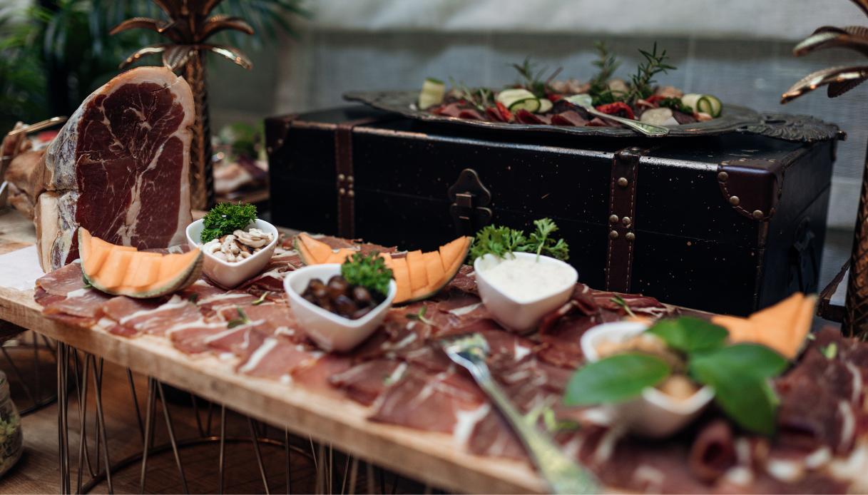 Un tavolo di degustazione con salumi, formaggi, cracker e frutta di stagione è un’idea deliziosa per l’antipasto di matrimonio estivo. Gli ospiti apprezzeranno la varietà, i sapori e la possibilità di muoversi liberamente componendo il proprio piatto.