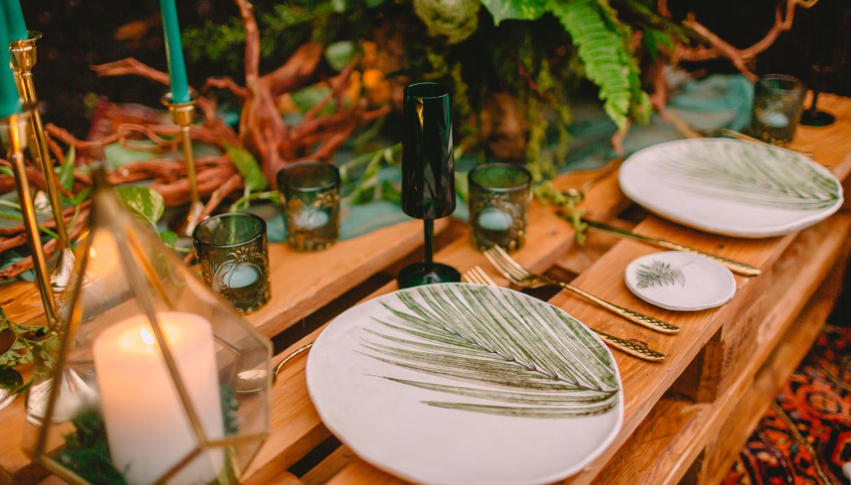 Per un ricevimento di nozze che ricordi le atmosfere della giungla potete affidarvi a tessuti naturali come lino, juta e legno grezzo per tovaglie e sedie. Prestate particolare attenzione ai centrotavola: per catturare l’essenza della foresta pluviale, intrecciate felci, fiori tropicali e rampicanti.