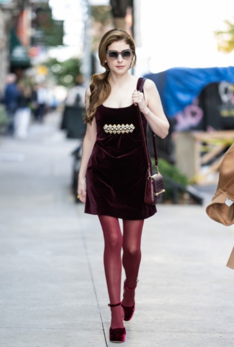 Un’altra star che ha optato per i collant colorati è l’attrice Anna Kendrick che ha sfoggiato un look tono su tono, bordeaux composto da calze, vestito corto, borsa e scarpe altissime. Un sogno, che possiamo provare a replicare anche noi.