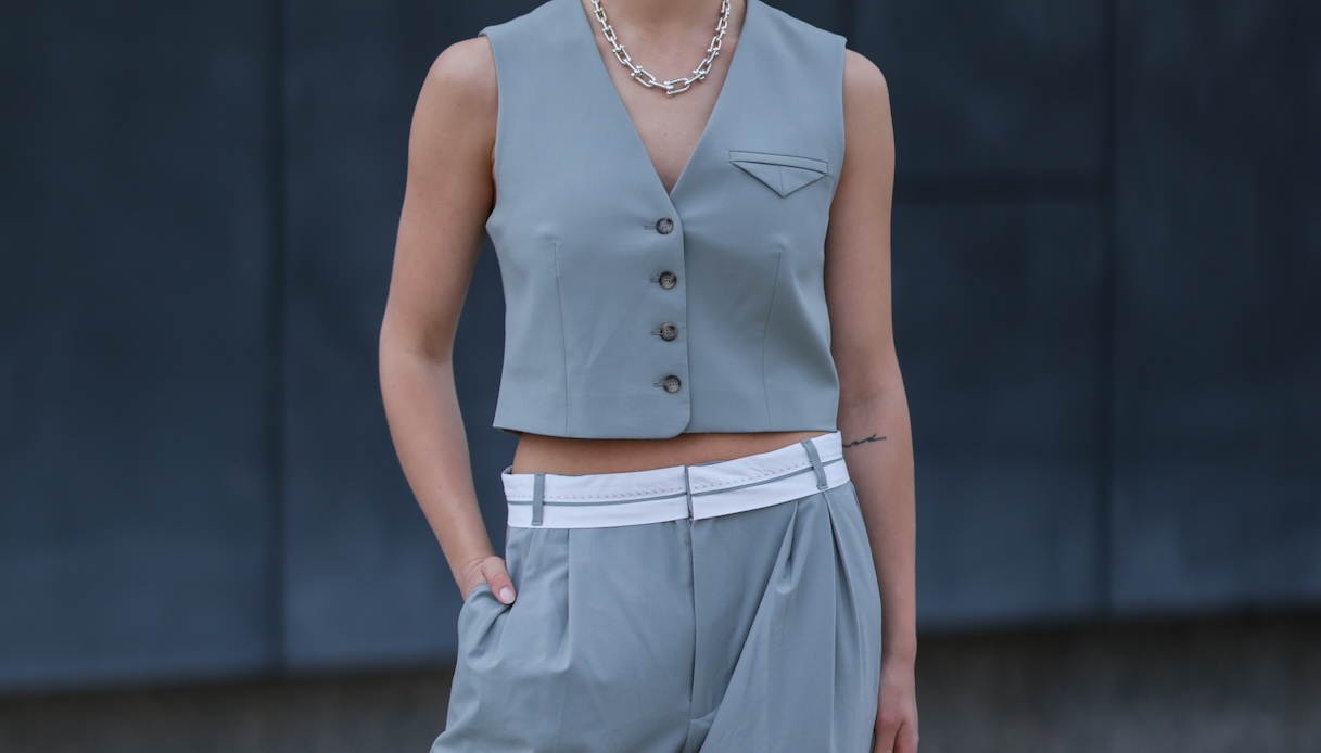 Una tuta grigia, un completo di gilet e pantaloni palazzo in tonalità grigio perla, da completare con accessori bianchi o neri e magari un pezzo statement coloratissimo sarà un modo perfetto per interpretare questo colore in chiave sportiva e molto chic.