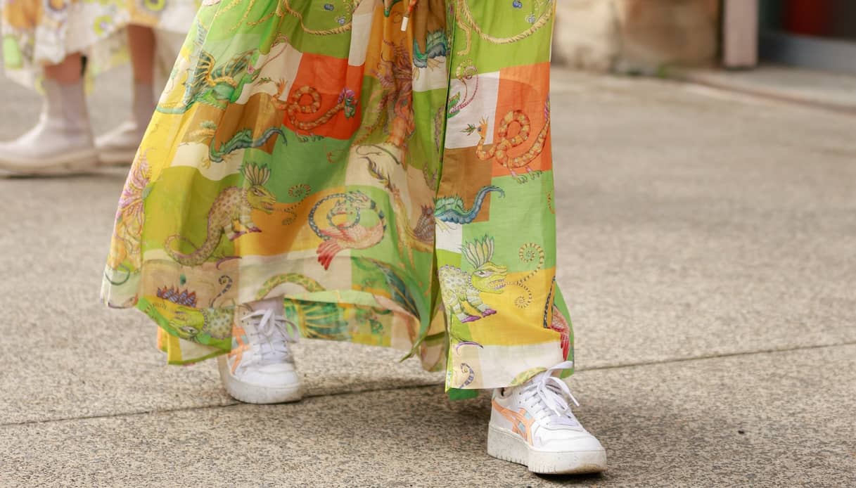 Per quelle tra voi che non hanno paura di osare, un paio di sneakers platform (non zatteroni eh, semplicemente con una suola un po’ più robusta aggressiva) rigorosamente bianche possono essere un’ottima idea per rendere cool anche l’abito più romantico e svolazzante. La borsa sarà mini e preferibilmente coloratissima.