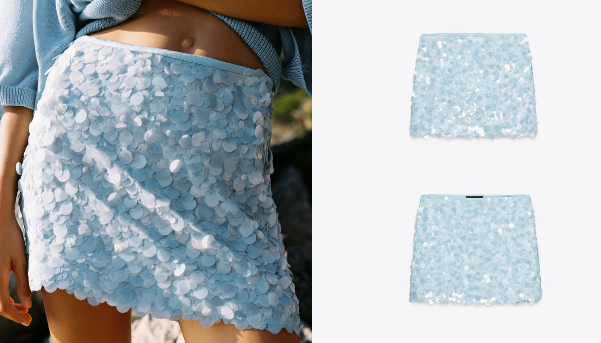 Azzurra come il mare e riflettente come il sole quando illumina l’increspatura delle onde, questa minigonna pailettes azzurre è un vero e proprio inno all’estate!