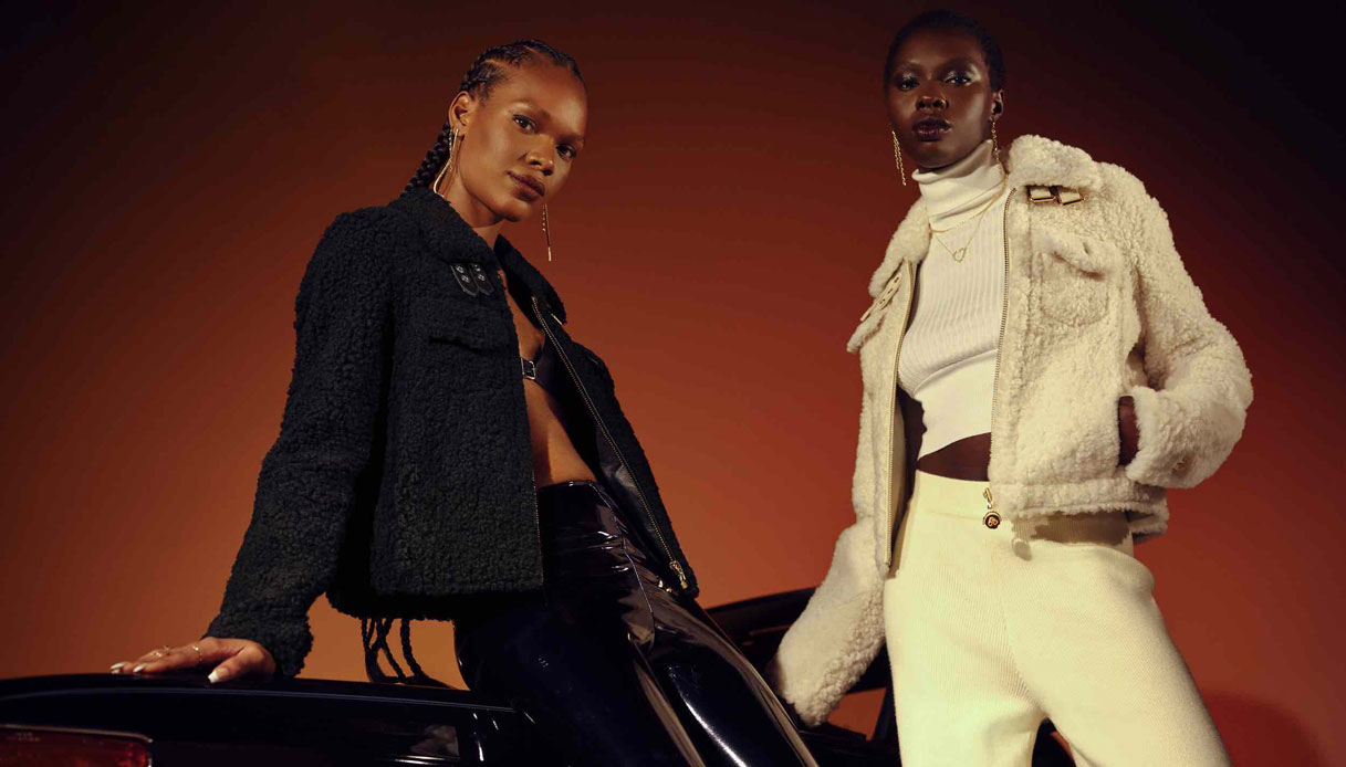 La trucker jacket in shearling è rifinita da un inserto in nappa nella parte posteriore, mentre la tuta aderente è declinata in velour Black, Ivory o Pale Pink. Completa la capsule collection la biker jacket in pelle con cristalli applicati a mano.