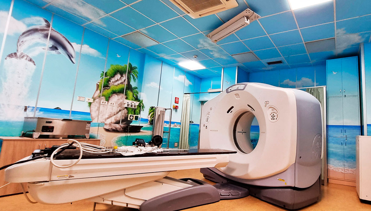 progettata per dare loro la sensazione di trovarsi su un’isola, dove il salto dei delfini, sorridenti, li accoglierà, li tranquillizzerà e consentirà così ai medici di conquistare la loro “fiducia a colori”, permettendogli così di avere un approcciarsi ai bambini con maggior facilità.