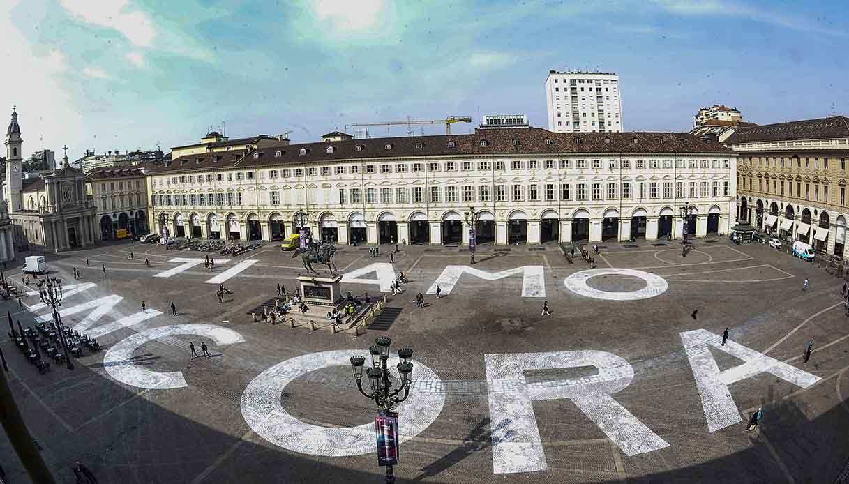 È per lei, è per questo Pianeta così bistrattato che la notte tra il 28 e il 29 marzo ben 150 persone si sono incontrate in piazza San Carlo, nel cuore del capoluogo piemontese, e hanno condiviso sei ore di lavoro, continuo e preciso, perché ogni lettera fosse visibile da ogni angolazione e perché il messaggio, visto dall’alto, fosse chiarissimo.