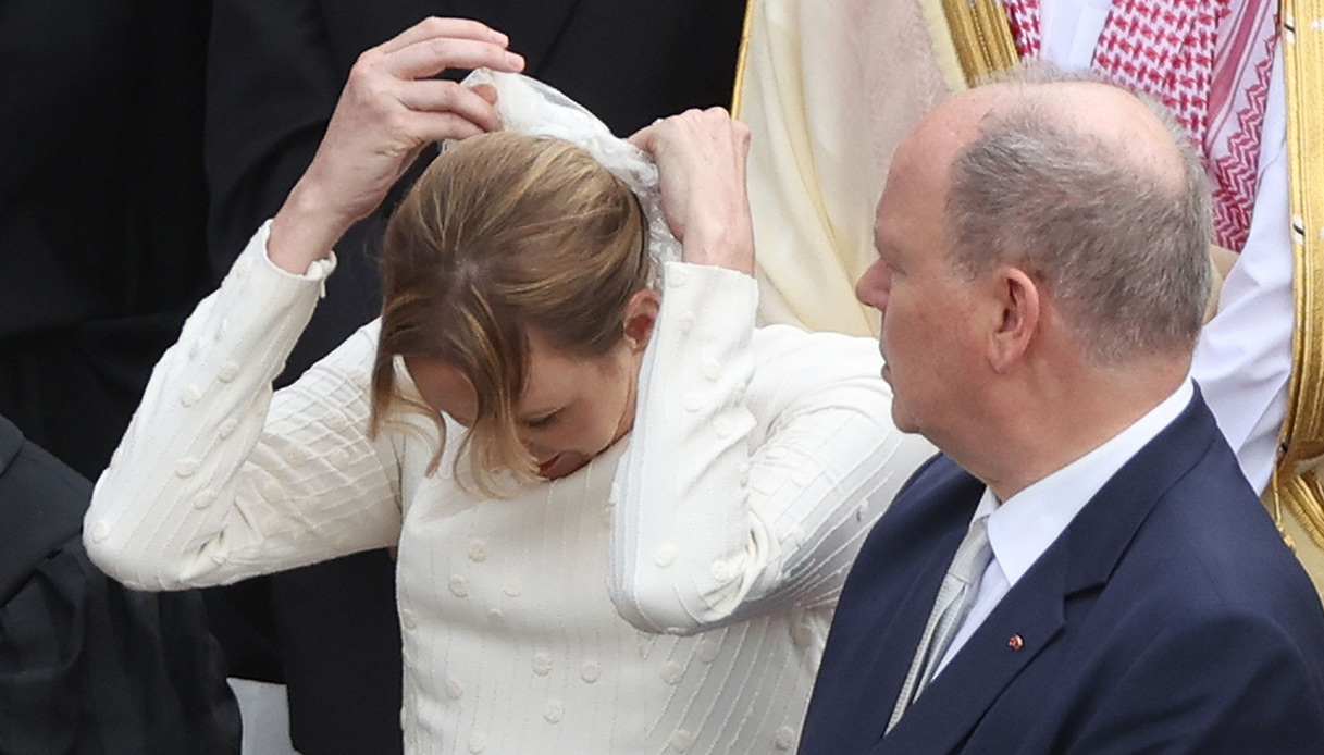 Charlene, come richiede il dress code, portava sul capo un velo bianco finemente ricamato, evidentemente solo appoggiato ai capelli e non fissato bene, perché a un certo punto della funzione è stata costretta ad afferrarlo con le mani. Può essere che un colpo di vento lo abbia strappato e per evitare che volasse via, l’ha preso con le mani. Poi lo ha tolto e se l’è rimesso sul capo.