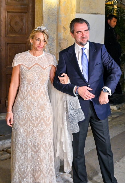 La sposa ha indossato una splendida creazione di Christos Costarellos, stilista greco con oltre 25 anni di esperienza apprezzato per i “design eterei ispirati da elementi tradizionali greci” in cui coesistono “tradizione e modernità”. Un abito bianco in pizzo Chantilly dai dettagli raffinati, impreziosito da un tradizionale velo in tulle di seta e dall’antica tiara di famiglia.