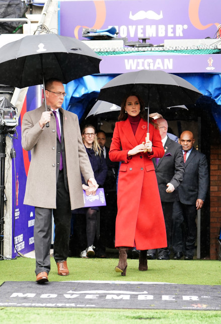 Ereditato il ruolo che era stato del cognato Harry, Kate si è presentata ai quarti di finale della Rugby League World Cup per acclamare la Nazionale Inglese e per sfoggiare un meraviglioso cappotto rosso firmato Alexander McQueen da circa 3400 euro. Completano l’outfit, un paio di orecchini di perle della designer britannica Annoushka Ducas, che possiede dal 2012, un dolcevita bordeaux e un papavero di lana appuntato sullo scollo del cappotto, a sostegno delle forze armate.