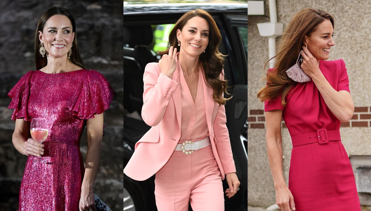 In linea con la dimensione fanciullesca dell’appuntamento di lavoro, la moglie di William si presenta con un abito rosa baby, una via di mezzo tra Cenerentola e Barbie, che va tanto di moda in questo periodo. Si tratta di un altro vestito midi in crepe, con maniche leggermente a sbuffo, colletto alla coreana, corpetto chiuso da piccoli bottoni tondi in stoffa, cintura incorporata ton sur ton, gonna svasata. Il modello si chiama Ahana, è firmato Beulah ed è acquistabile per 804 euro circa.
