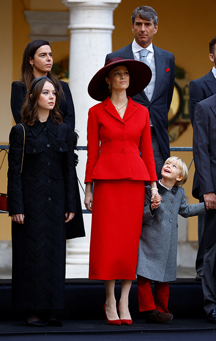 Era inevitabile, visto che la moglie di Pierre Casiraghi è brand ambassador di Dior. La Borromeo la indossò di color rosso, abbinandola a una longuette dello stesso colore e décolleté in suede in tinta. Completò il suo look con un importante cappello a tesa larga, molto sofisticato.