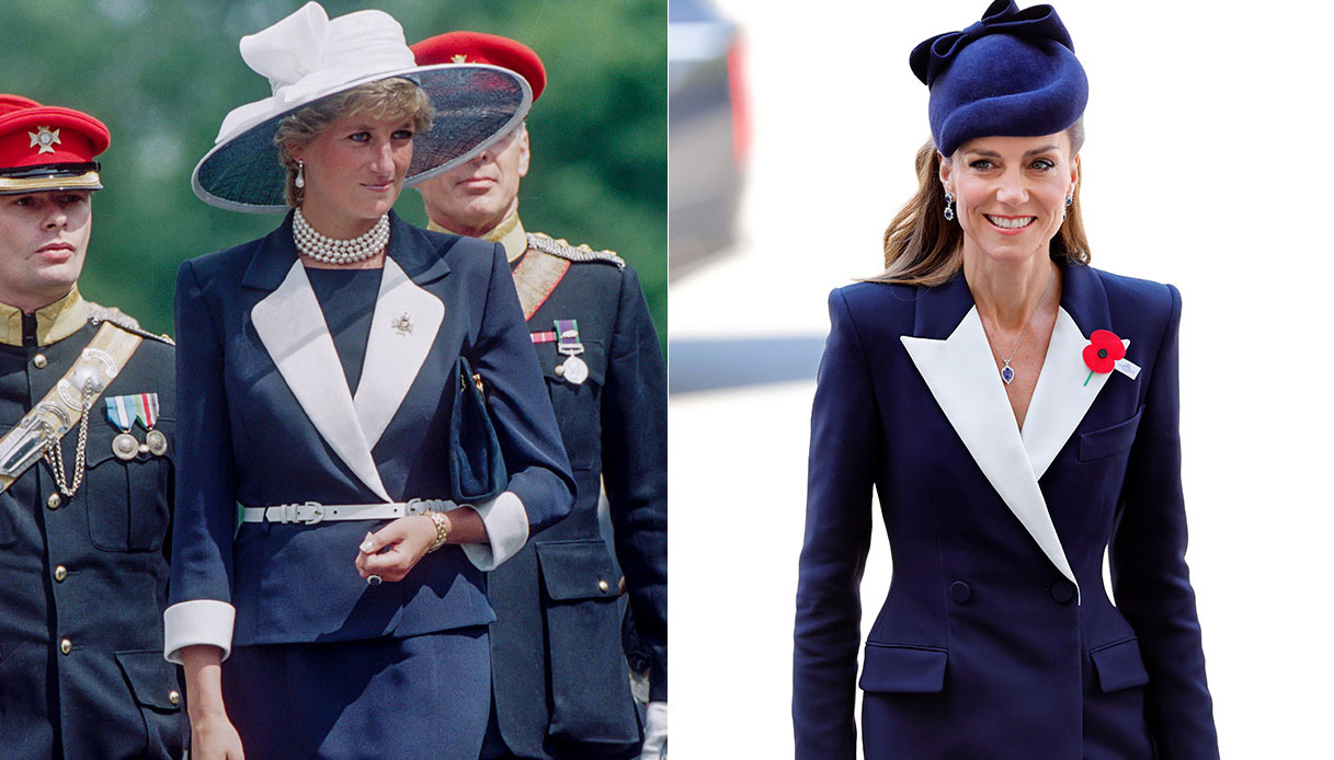 L’outfit di Kate era praticamente identico a quello che Diana indossò nel luglio 1995 per presentare le nuove insegne al Reggimento dei Dragoni Leggeri a Bergen-Hohne, in Germania. La mamma di William si presentò con tailleur blu scuro con revers, polsini e cintura bianchi, completando il suo look con un cappello a tesa larga coordinato e décolleté blu scuro e decoro bianca.
