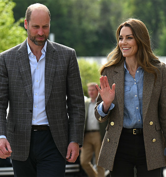 Lady Middleton si è presentata con un blazer scozzese, firmato Holland Cooper, a doppio petto con bottoni dorati, che costa 549 sterline. Sotto indossava una camicia casual celeste, abbinata a jeans skinny marroni che la facevano apparire ancora più magra, e scarponcini da trekking.