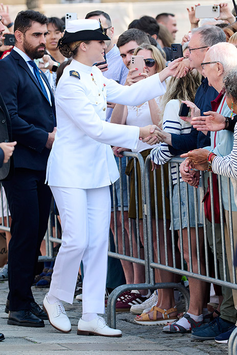 Così, Leonor si è presentata con l’uniforme bianca di guardiamarina alla cerimonia di consegna che si è svolta a Pazo de Raxoi, a Santiago di Compostela dove la Principessa è stata accolta da una folla festante che lei è andata prontamente a salutare e ringraziare, stringendo mani e prestandosi a dei selfie. In effetti, Leonor è molto apprezzata in quella regione, tanto che la motivazione con cui ha ricevuto l’onorificenza è stata per “affetto e rispetto del popolo galiziano“.