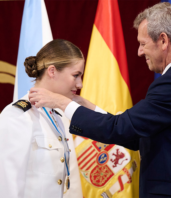La figlia di Letizia di Spagna è stata accolta dal Presidente della Xunta, Alfonso Rueda, tra gli altri dignitari. Dopo la consegna della Medaglia, Leonor ha tenuto un discorso, per la prima volta in galiziano, gesto che è stato molto apprezzato dai presenti, durante il quale ha ringraziato per l’accoglienza ricevuta.