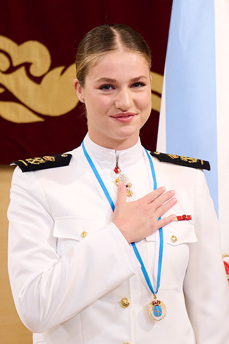 Leonor di Spagna ha terminato il viaggio in mare a bordo della nave scuola Juan Sebastián Elcano, concludendo così il suo percorso di formazione in marina e ha ricevuto la Medaglia d’Oro della Galizia. La Principessa delle Asturie si è presentata alla cerimonia di consegna in alta uniforme bianca e con un make up che puntava tutto sullo sguardo. Nessuno è riuscito a resistere al suo fascino.