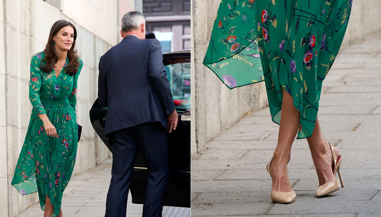 Dopo averci deliziato con il magnifico abito bianco in pizzo e aver esaltato la sua linea tonica con i pantaloni bianchi a culotte, Letizia di Spagna recupera dal suo armadio quello che è diventato un grande classico dell’outfit estivo, ossia il suo abito verde smeraldo a fiori viola e rossi, di Maje.