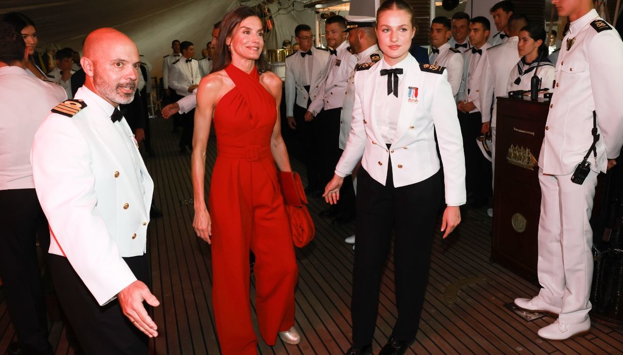 Se la Principessa Leonor ha presenziato alla cerimonia con l’uniforme estiva della Marina Militare, Letizia di Spagna ha indossato una tuta rossa con scollo all’americana di Mango, a cui ha abbinato delle zeppe color oro. Letizia, orgogliosissima della figlia in un giorno così importante, è rimasta vicina a lei dopo esserci abbracciate al porto e poi riunite al ricevimento.