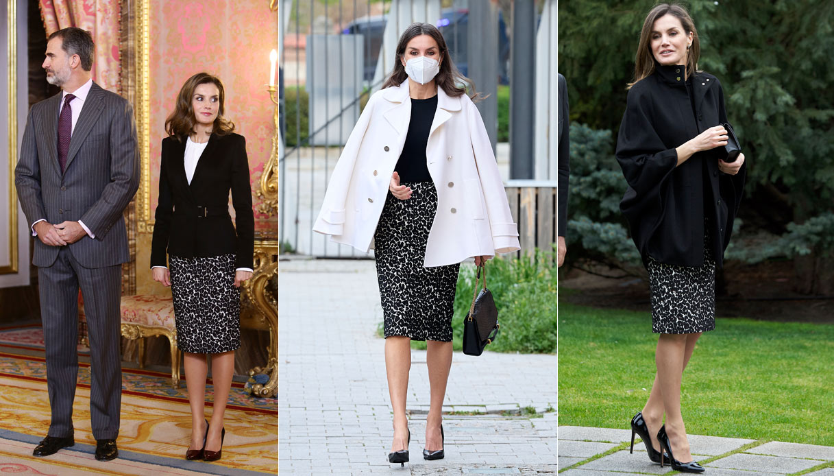 La Reina dunque ha osato scegliere una gonna animalier, una fantasia di solito giudicata aggressiva e seducente, ma non particolarmente raffinata. D’altro canto, Donna Letizia ci ha mostrato come abbinarla per renderla elegante. Il capo che ha recuperato dal suo armadio è una gonna a tubino, leopardata, a macchie bianche e nere, di Roberto Verino.