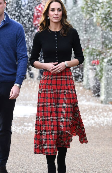 In quell’occasione, Kate aveva abbinato alla maxi gonna di colore rosso con check evidente una maglia nera aderente con piccoli bottoni frontali e maniche lunghe. A completare l’outfit, un paio di stivali neri in suede o pelle morbida, perfetti per la stagione invernale.