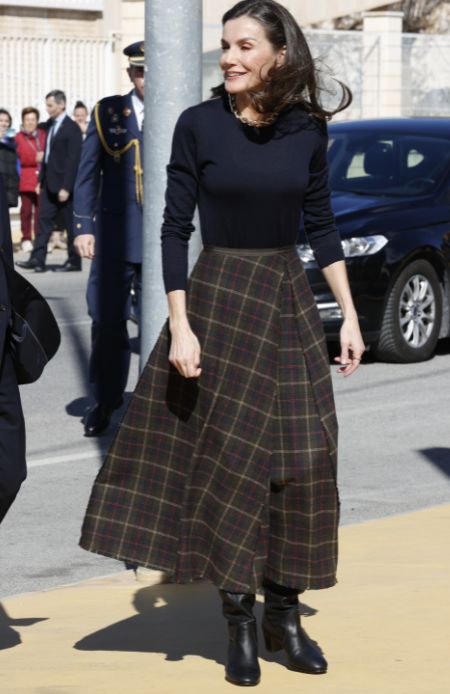 La Reina ha infatti scelto una gonna midi in fantasia tartan di Bimba y Lola, caratterizzata da fondo scuro e sottili righe rosse, a cui ha abbinato una maglia a collo alto aderente color blu notte. A completare il look, un paio di stivaletti neri in pelle, con tacco medio e punta leggermente arrotondata.