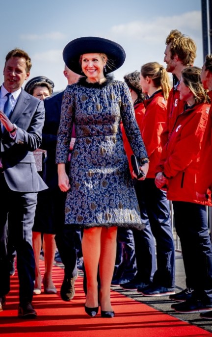 Maxima d’Olanda ha completato il look con uno scenografico capello blu a falda larga, una borsa a portafoglio e un paio di scarpe col tacco in tinta.