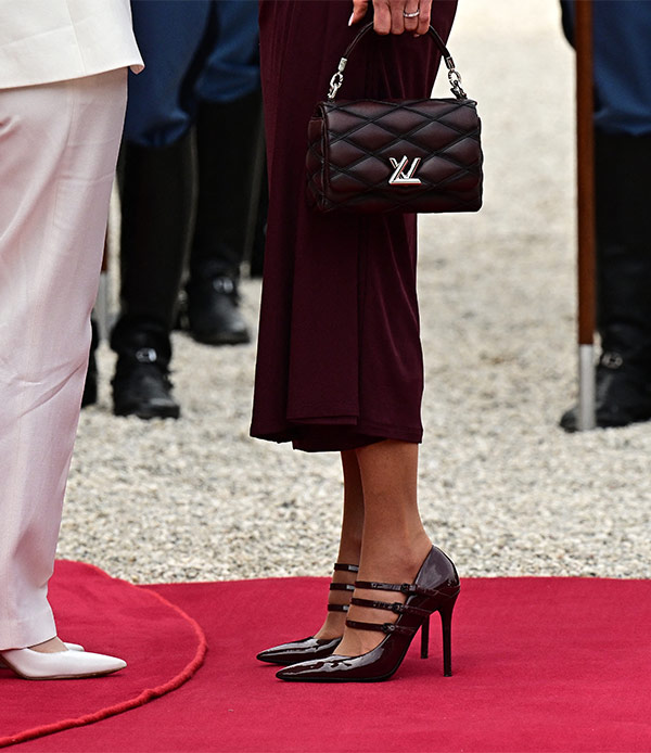 L’accessorio griffatissimo del look di Rania è la borsa. Si tratta di una handbag trapuntata con logo sul davanti di Luis Vuitton, il cui valore supera di gran lunga i 2mila euro. Altro dettaglio chic sono gli occhiali da sole che ha tolto per le foto ufficiali con Giorgia Meloni. Da notare anche la splendida manicure bianco latte.
