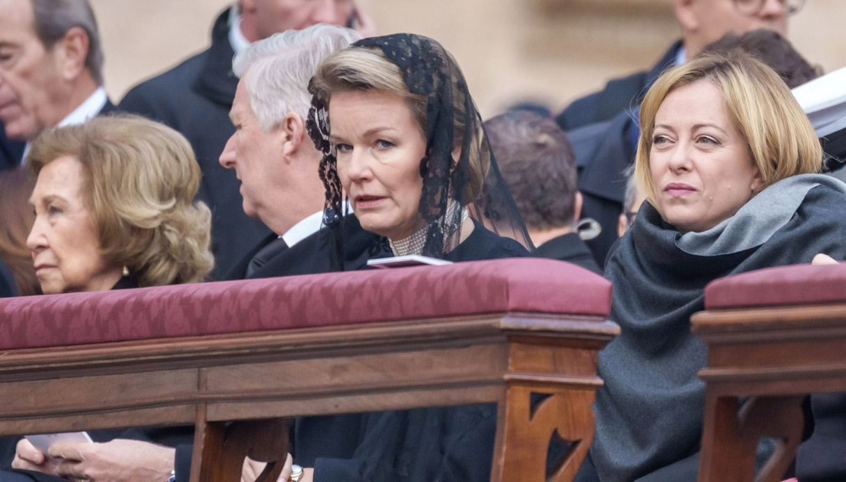 La Regina madre Sofia di Spagna, la Regina Mathilde del Belgio e suo marito Filippo in Piazza San Pietro per i funerali di Papa Benedetto XVI. Nella fila accanto alla loro, ci sono Giorgia Meloni e Sergio Mattarella.