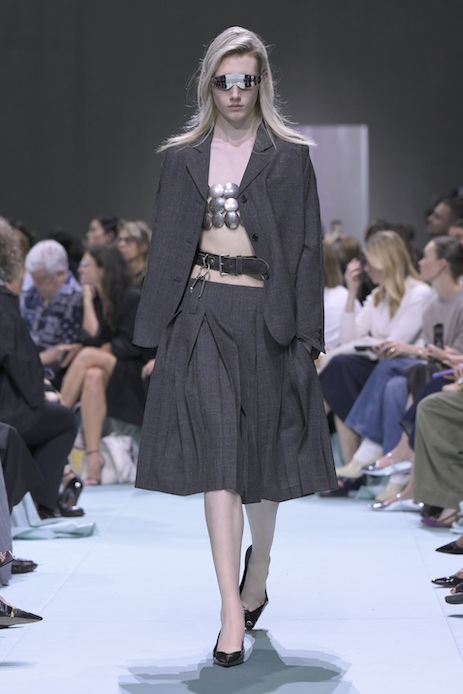 Il completo, preso direttamente dalla sfilata Prada di settembre, è un capolavoro di sartorialità decostruita. Il blazer oversize in lana grigia ha un taglio maschile e una struttura volutamente loose, che si bilancia con il bustier metallico che sfoggia sotto, un vero statement piece.
