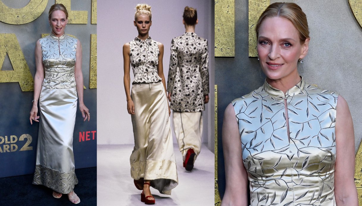 Se Charlize era tutta vibrazioni da catwalk contemporanea, Uma Thurman ha scelto un’eleganza senza tempo. Il suo look è composto da un top smanicato con collo alla coreana e una lunga gonna in raso lucente, perfettamente coordinati. Ma il dettaglio che cambia tutto è che si tratta di un completo Prada d’archivio, datato 1997. Un pezzo di storia della moda, presentato in passerella da una delle modelle dell’epoca e oggi riportato in vita da Uma con la grazia che solo lei può avere.