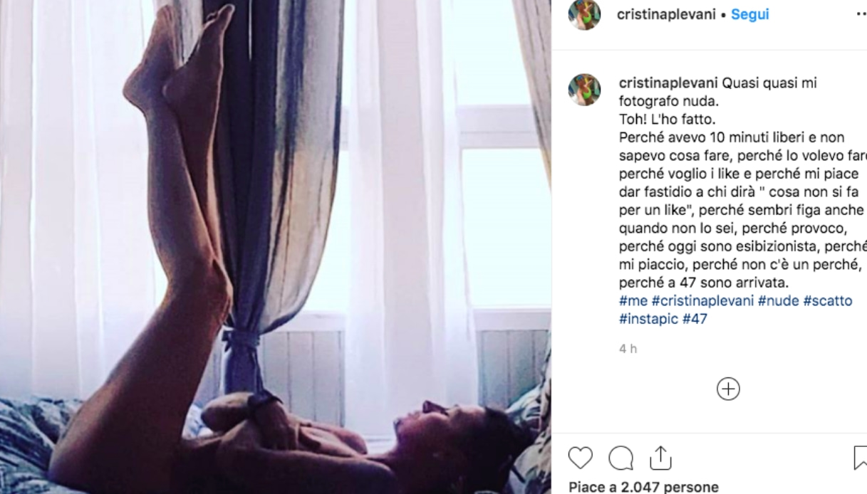 “Quasi quasi mi fotografo nuda – ha commentato la Plevani -. Toh! L’ho fatto. Perché avevo 10 minuti liberi e non sapevo cosa fare, perché lo volevo fare, perché voglio i like e perché mi piace dar fastidio a chi dirà ” cosa non si fa per un like”, perché sembri figa anche quando non lo sei, perché provoco, perché oggi sono esibizionista, perché mi piaccio, perché non c’è un perché, perché a 47 sono arrivata”.