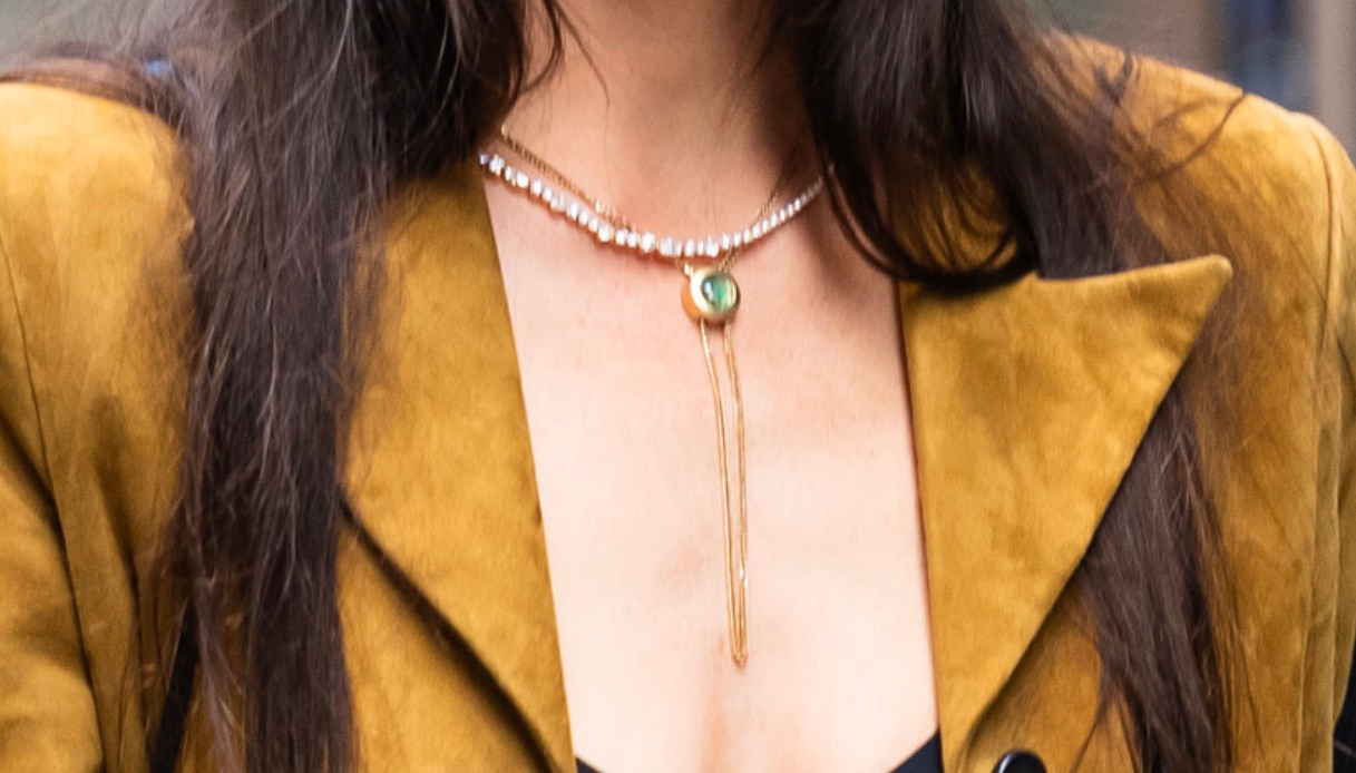 A illuminare il volto di Dakota, due collane sontuose che superano da sole i 134.000 dollari in valore. La prima è la Emerald Victorian Slider Necklace firmata Ophelia Eve, dal valore di 10.430 dollari: un girocollo sottile con un ciondolo a goccia in smeraldo e diamanti, montato su oro. Un pezzo delicato, d’altri tempi, con un fascino regale ma leggero.