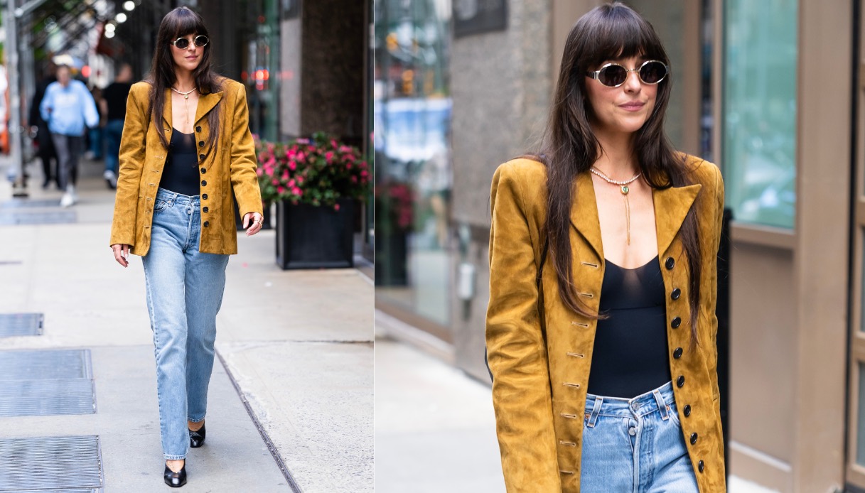 Il cuore dell’outfit è un blazer di camoscio giallo miele firmato Khaite, tratto dalla resort collection 2026 del brand newyorkese. Un capo dalla linea sartoriale decisa e un po’ rétro, con bottoni neri a contrasto e un taglio aderente che valorizza la figura con sobrietà e carattere. Sotto, Dakota ha scelto un body nero scollato – quasi un leotard da ballerina urbana – abbinato a un paio di jeans chiari dritti a vita alta, dalla silhouette rilassata e senza strappi.