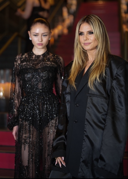 E accanto a lei, la figlia Leni – classe 2004, 21 anni appena compiuti – si è presa la scena con una sicurezza che solo chi è cresciuta tra backstage e obiettivi può avere. Il suo look era una dichiarazione d’intenti: trasparenze audaci, silhouette corsetto, eleganza gotica e dettagli couture. La giovane modella ha indossato un abito lungo firmato Zuhair Murad, interamente in pizzo nero e tempestato di micro-paillettes tono su tono. Il gioco di vedo-non-vedo lasciava intravedere una lingerie nera con corsetto a cuore, strategicamente abbinata.